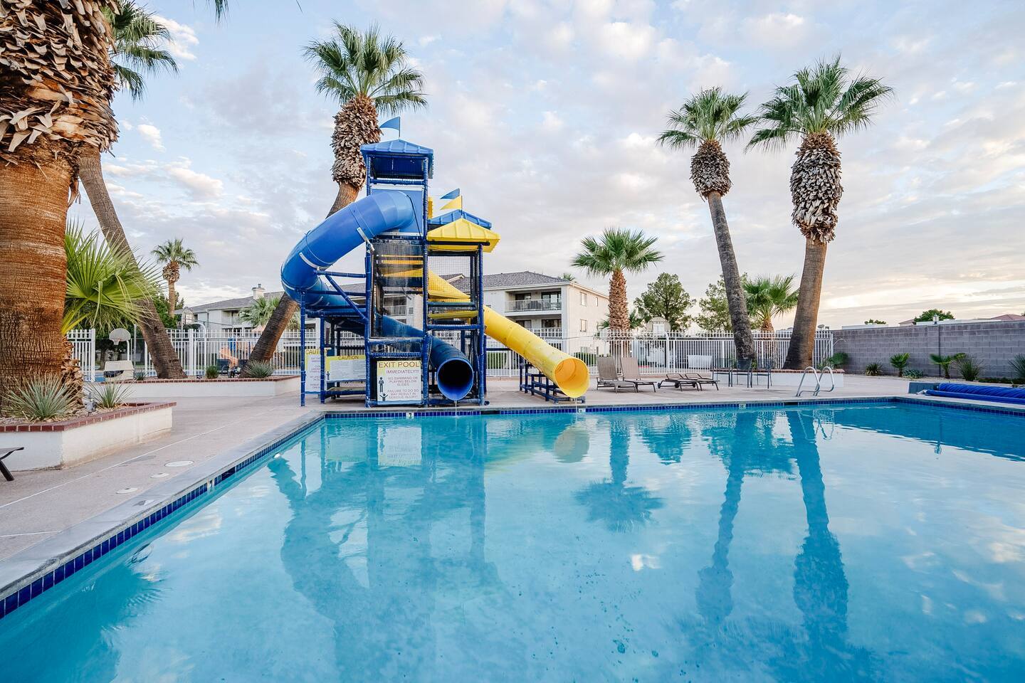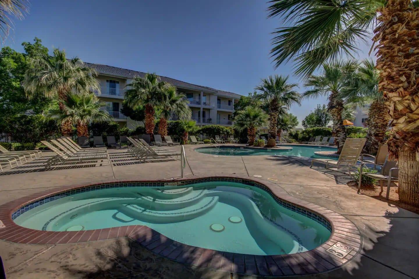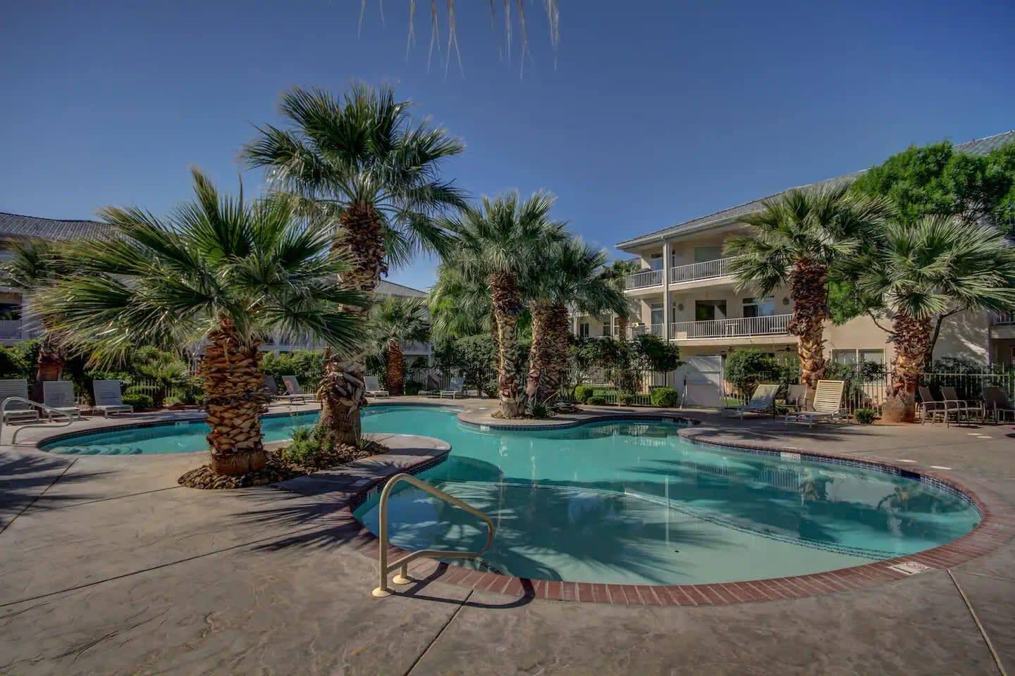 Our Las Palmas Escape Condo is a beautiful spacious unit, offering all the amenities you would need to feel right at home. This condo is all on one level, consisting of two bedrooms with queen size beds, the third bedroom has a queen sized Murphy Bed, along with three full bathrooms for everyone's convenience. There is a full kitchen, a dining area, lovely living room, plus a separate laundry room too. Through both the patio doors in the living room, and the master bedroom, is a large balcony with patio furniture, a full size BBQ, and stunning views of the mountains and surrounding area. There is a Smart television above the fireplace that can be used to stream any company you many have an account with eg, Roku, Netflix, Hulu, Disney, etc. Internet is included. Free parking for more than one car is available outside the building, and there is a garage for rent at $25/day so you can store any outdoor equipment you may bring. There is a free pass in the condo for your use, it allows up to 10 people full access to all the facilities at the resort, here's a few suggestions of what you could do, go and check out the activities in the clubhouse, like billiards, the exercise room, or just pick something up at the snack bar and just relax in the lounge area, or choose to play tennis, volleyball, basketball or even pickleball, and shuffleboard is available too. Play a bit of golf, or go for a swim in any of the pools there, (the inside pool is heated, the outside pool is not), or just soak and relax in any of the hot tubs, Plus the children are going to enjoy the children's play areas, splash pad. and pools, some even have water slides too, There are also walking trails, or if you prefer to ride a bike go cycling on the bike trail instead. or just stay on site and enjoy the beautiful grounds offering plenty of mature Palm Trees. Other places to visit outside of the resort include a BMC Activity Center which is right next door which also has a Ninja course and roller skating rink, or visit Zion's Canyon, Snow Canyon, Sand Hollow Reservoir, Thunder Junction Park and train ride, or Tuacahn Theater all of which are close by, or if you feel like a little drive out you could visit Zion's National Park, or Shakespeare Theater in Cedar City which are both about 45 minutes away. The resort is close to lots of restaurants and shopping locations too. This unit is not pet friendly, and the resorts bylaws do not allow animals or smoking anywhere on the property. Available discounts: 5% off weekly bookings, and 10% off for monthly or longer stays, applied at checkout. Las Palmas Escape is professionally managed by Stay Short Term Vacation Rentals.