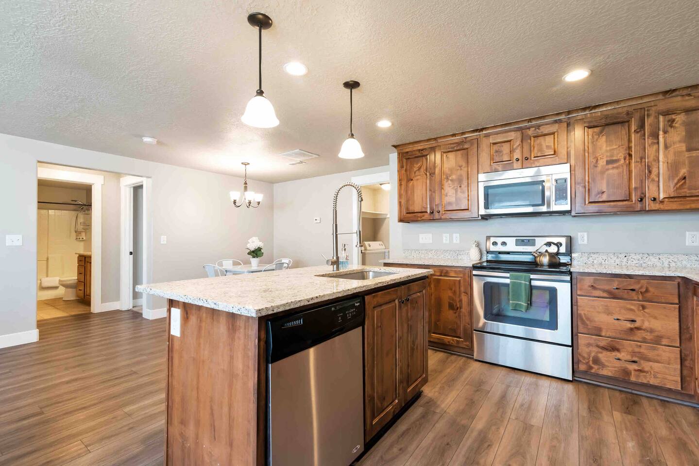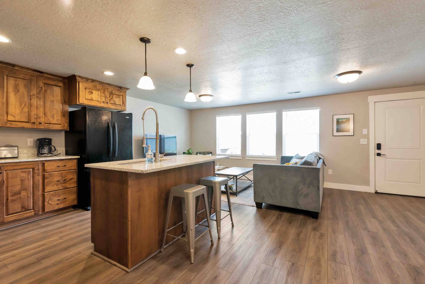 Set in a nice quiet location in the heart of Vineyard, close to Orem, this newly renovated apartment features stain grade cabinets and updated appliances. Monthly reservations are required to meet city requirements, the apartment is pet friendly. You look out onto a grassy backyard with some landscaping, plus an outdoor patio with seating and a fire pit. Free parking is also available on site. Conveniently located, only 16 minutes to skiing at Sundance, 2 minutes to the Links Golf Course, 6